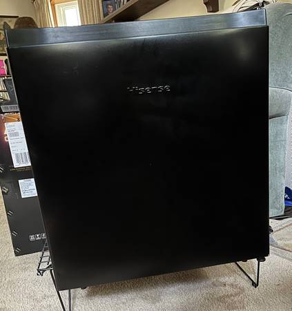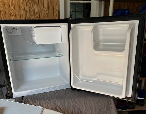 Hisense 1.6 cubic foot mini-refrigerator. Excellent condition, just one year old. Approximately 18x17x20 inches. Small chiller compartment. Removable glass shelf. Adjustable thermostat. Bottle rack.