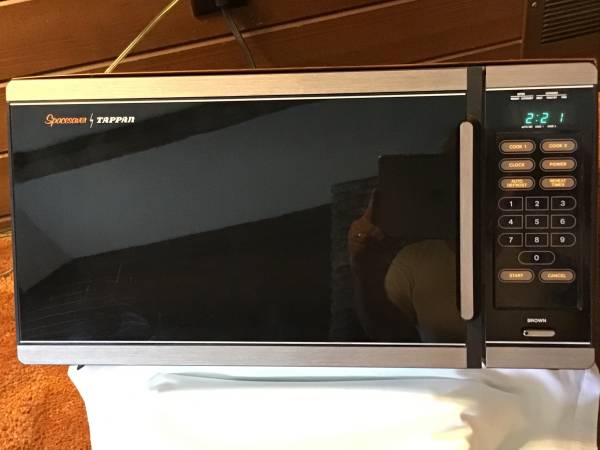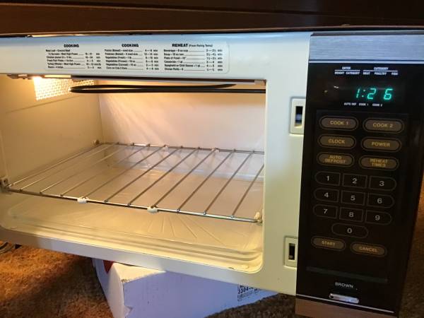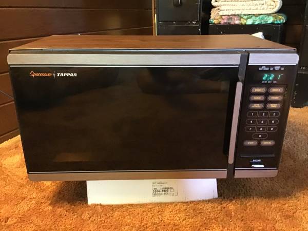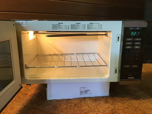 Attractive older microwave with wood-look cabinet, antique brushed gold-tone trim, and unique browning element. Light and control panel function, but the fan doesn’t nor does the food cook. Repair could be simple, I suspect a blown fuse, or cost-prohibitive, I don’t know. Perhaps good for parts, such as the heavy glass tray, chrome wire rack, light bulb, which is fairly new and cost about $9, browning element (a scarce, but great feature), or cabinet. Works as a clock and has man repurposing potential. Owner’s Guide included. Outside dimensions: 12.5”h x 22.9”w x 12.8”d. Buy ‘as is’ for $8.