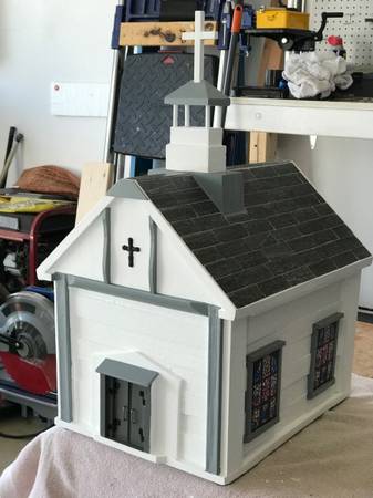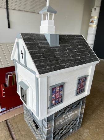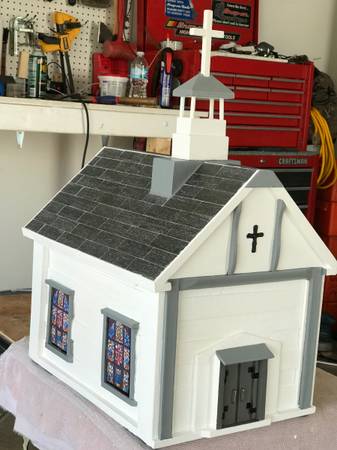 Hand made Church, with bell tower, tile roof, stained glass windows.