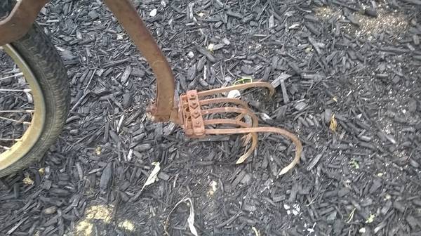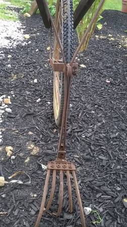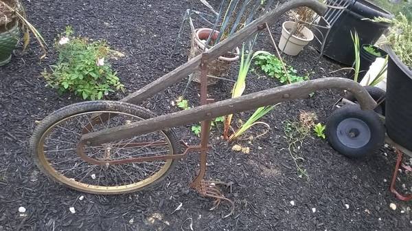 THIS IS A GOOD OLD PLOW THAT YOU PUSH ACROSS THE GROUND AND IT ACTUALLY STILL WORKS . COMES WITH THE OLD METAL TIRE AND THERE IS AN EXTRA BICYCLE TYPE TIRE THAT COMES WITH IT CALL OR TEXT