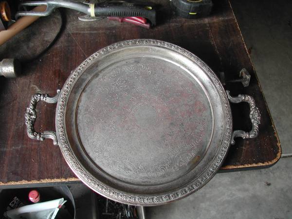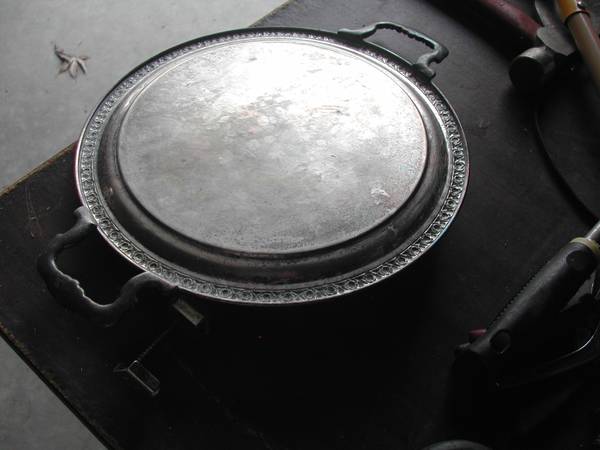 Antique Silver Plated Tray for sale ...about 12" diameter with two handles. text after 10 am. Sold As Is. PRICE IS FIRM at $30 *IF AD IS LIVE, ITEM IS STILL AVAILABLE LOCAL PICKUP ONLY - CASH ONLY...