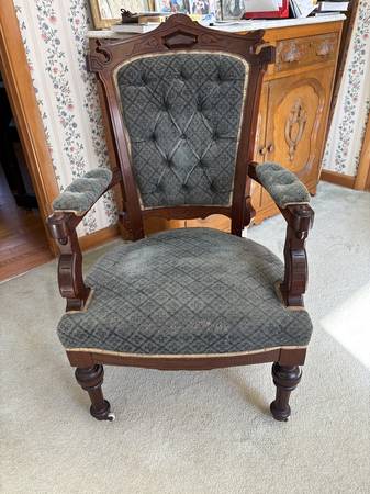 2 antique chairs, matching woodwork and upholstery Larger chair: 24"w x 39"h x 24"d smaller chair: 18"w x 37"h x 24"d