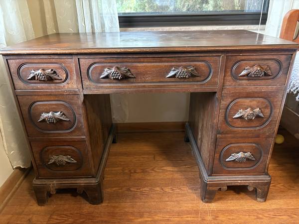 solid Walnut desk. The finish on top is a little rough. Very sturdy (heavy) and well made. Drawers open and close very smoothly.