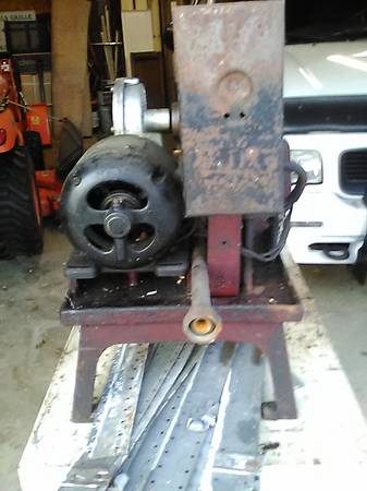 Antique pump setup, with old breaker box, electric motor, 3 piston, ignition switch, all mounted on metal stand.