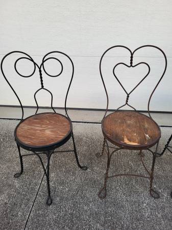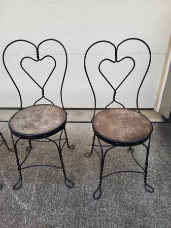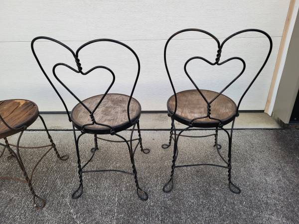 Used heavily used twisted wrought iron chairs. Seats is 14 1/2" in diameter. 35 inches high.