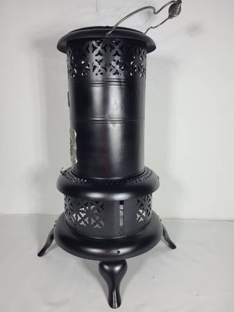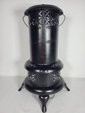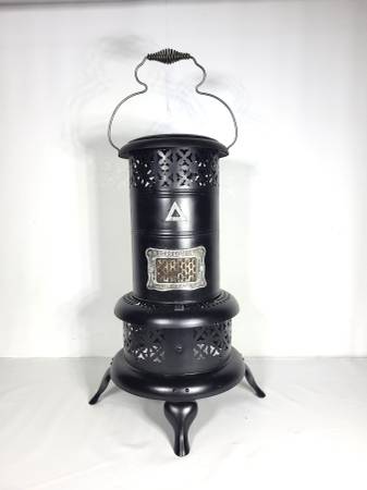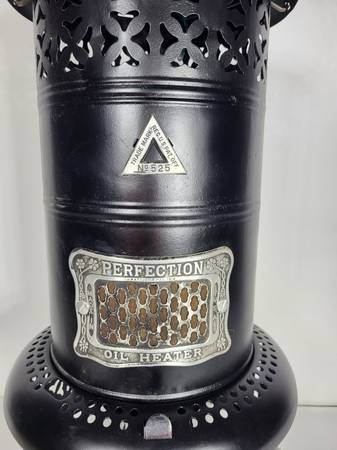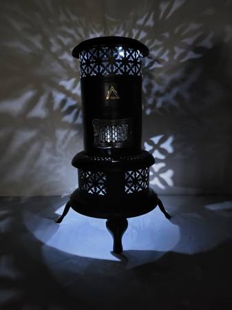 1920's Perfection Heater No.525 for decor. Been painted, fuel tank removed and replaced with AA strand lights. Controller located back side bottom. 24 1/ inches tall not including the handle height.