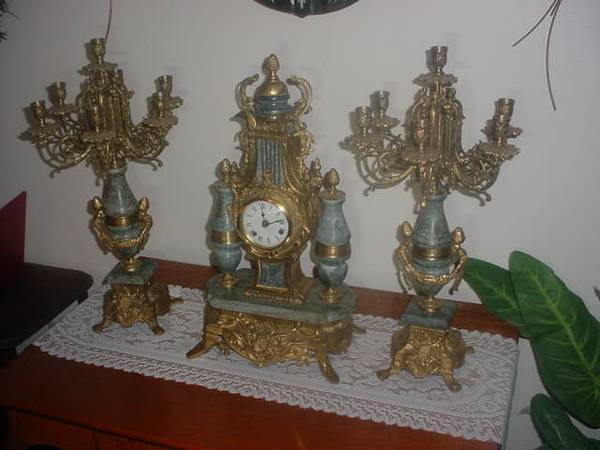 SUPER HEAVY METAL AND MARBLE MATCHIG THREE PIECE CLOCK SET WITH CANDLE LABRAS....WILL EXCEPT A DECENT OFFER, NO STUPID LOWBALL OFFER'S, I WONT RESPOND...CLOCK WILL NEED ATTENTION,