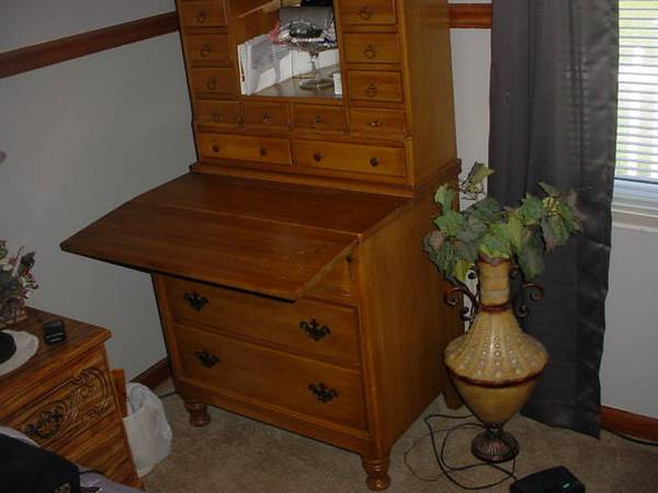 59 INCHES TALL X 29 INCH WIDE A ANTIQUE SECRETARY LOTS OF DRAWERS, SMOKE AND BUG FREE, RARE FOR ONE LIKE THIS,HAS THE FLIP OVER WRITING PAD.