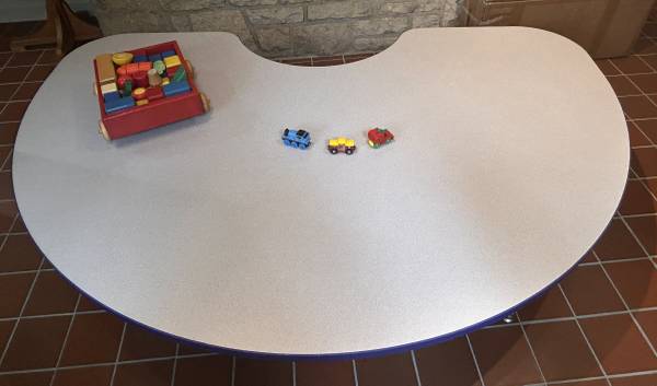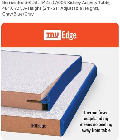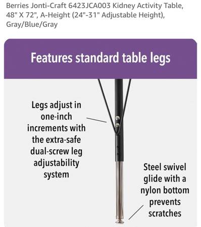 This activity table is perfect for any learning space. The 1"-thick, scratch-resistant laminate makes it durable and easy to clean. Extra-safe dual-screw legs adjust in 1" increments and are quick-mounted for easy installation. The upper leg is powder coated to match the TRUEdge color, and nylon-based swivel glides prevent rusting. Height adjusts from 15" to 24".
