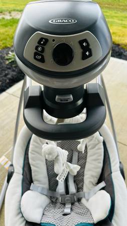 Graco DuetSoothe electric baby swing and rocker (works om batteries as well). Rocker can swing back and forth or side to side. 6 speeds of swinging operation. Rocker comes off the swing and can be ported anywhere for hands-free operation while you get work done. Swing set also comes with music, jingles and soothing tones. Hanging toys for baby's entertainment. Fabroc comes off completely and washable. Hardly used and kept in pristine working condition.