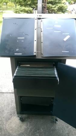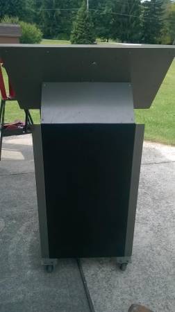 HAVE TWO OF THESE HEAVY DUTY METAL PODIUMS ON WHEELS\ I THINK THEY USE TO BE IN A HARLEY DAVIDSON DEALER , HAS THEIR LOGOS ON IT VERY NICE CALL OR TEXT