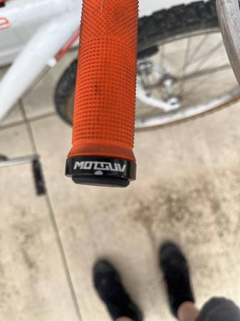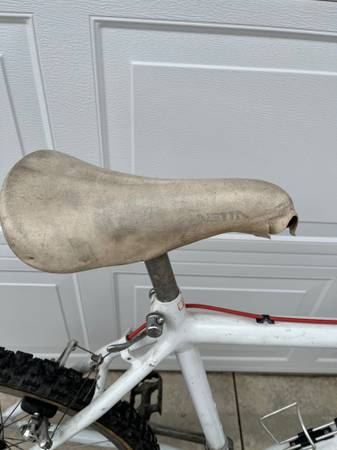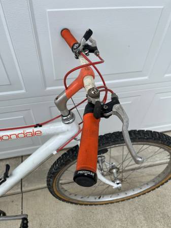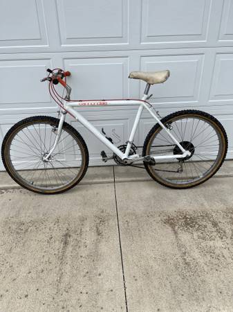 1980's Cannondale Mountain Bike - 21" frame - 26" x 2.00 tires. Suntour derailleur set. Vetta seat has a small rip in the nose. White frame with orange accent colors. Please email with questions.