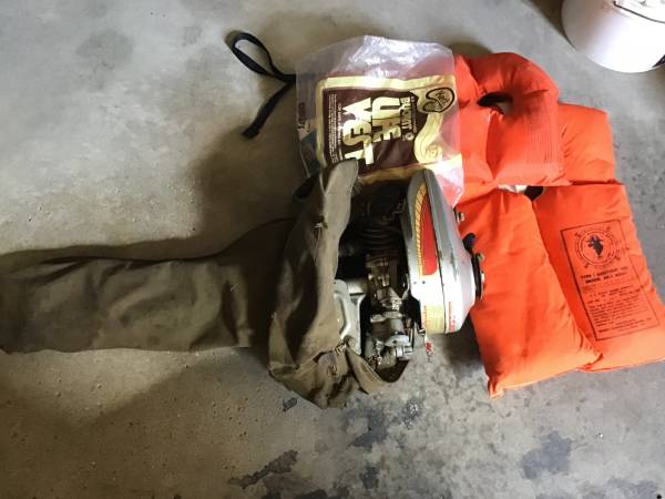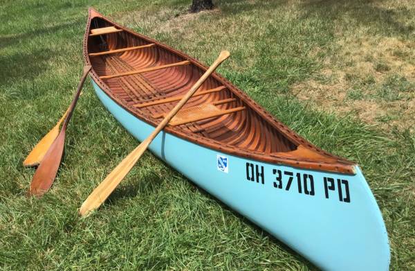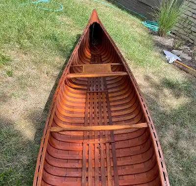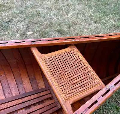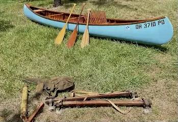 The open gunwales are spruce, ash was used for thwarts, deck, & keel, with cedar planks & ribs, caned seats, and brass hardware - including bow and stern guards. Wood finished with spar varnish and the canvas with marine paint. Though Old Town now offers a blue, it was the original green until several decades ago. Also included is: an outboard gas motor, backrest, three different size oars (one an OT spruce), a car carrier (needs new cups), and four USCG life vests (2 adult, 2 child).