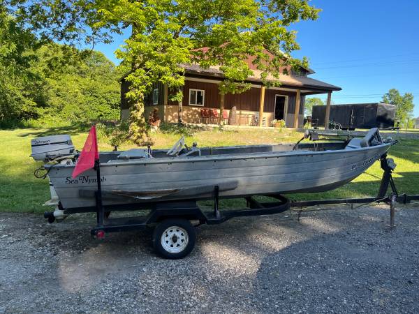 1979 Sea Nymph Aluminum boat with 20hp johnson (Have TITLE FOR BOTH) also has electric trolling motor.Also comes with the trailer. Has not been in water for about 7 yrs. Needs some work. Motor will start but does not want to stay running. It ran fine in the past. Great boat for someone that wants to put a little work into it. $950.00 or best offer. NO TRADES Seven four 0. three nine six zero zero eight nine