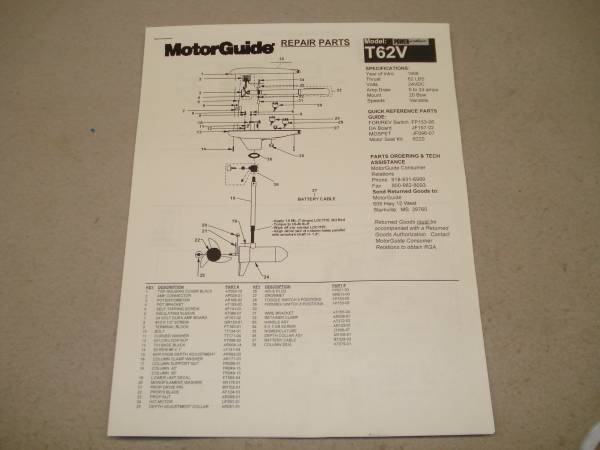 MotorGuide Trolling Motor, Model No. T62V, 24 Volt, 62 LBS Thrust 24 VDC, 0 to 33 Amps Draw, Variable Speed, Forward / Reverse Switch Measure shaft from bottom of Head to where the shaft enters the...