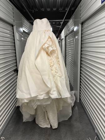 Worn once for about 3 hours, size 4, cute 3D rose pattern built in, sweetheart neck line, stored properly in a temperature controlled area. Corset feel that keeps the top up and secured in place. Full length, I’m tall so depending on your height it may need to be hemmed.