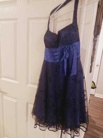 Beautiful dark blue Halter Dress with black velvet, lace and sequin floral embellishments. Layered taffeta and tulle. Built-in bra. Above the knee. Pleated side bow. Back zipper. Tapered at the waist.
