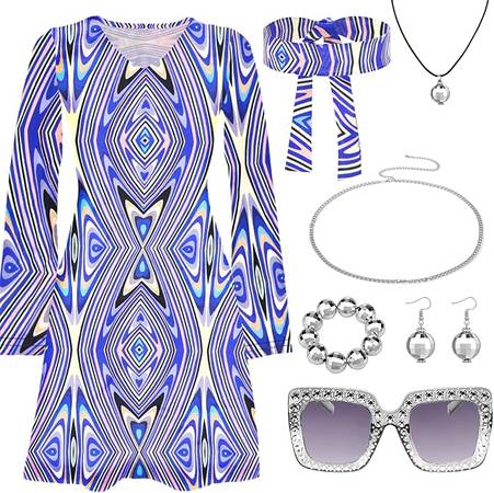 70s outfits for women: 7 pieces, including 70s Disco Dress, 70s Disco headband, 70s Disco glasses, Disco ball earrings, Disco ball necklace, Disco ball bracelet, Fashion waist chain belt.