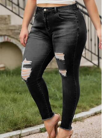 Modest Design -- Plus size high waist jeans for curve women with skinny fit, 5 pockets, zipper fly button closure, raw hem, destroyed detail and ankle length is perfect for most body shapes and enhance your curves