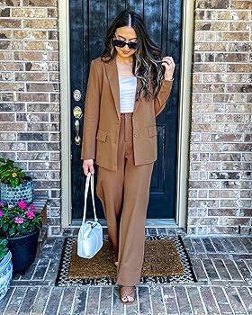 A womens pants suits sets featuring a blazer with single breasted design, peak lapels, front flap pockets, and long sleeves.