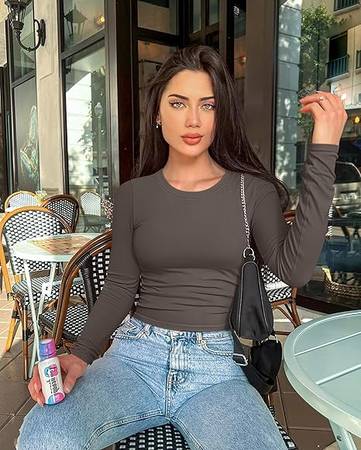 This long sleeve shirt is made of 90% nylon 10% spandex. Light weight, super soft and high-stretch fabric with a second skin feel. Cropped and stretch fitted style, waist ruched, crew neck, you can wear it regularly, cute, classic, slim fit, casual style fashion.
