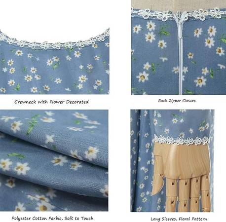 Fabric - 70% polyester and 30% Cotton; The prairie pioneer dresses for women are made with polyester cloth in a small floral pattern. Lightweight and comfortable wear, not see-through.