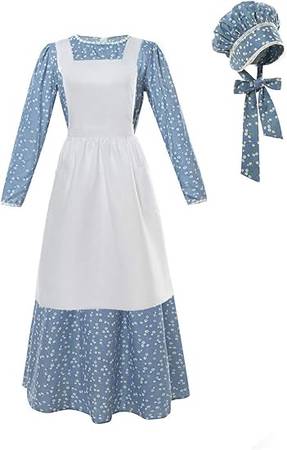 Style - Three-piece women's pioneer costume, includes one floral prairie dress, one matching lace ruffled bonnet, and one white apron. These American historical dress-up costumes make the story become very real. Wearing this colonial pilgrim dress back you to the history of late 1800s and early 1900s.
