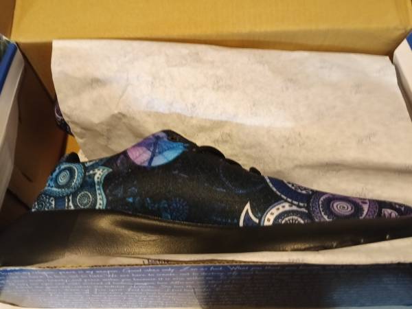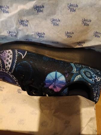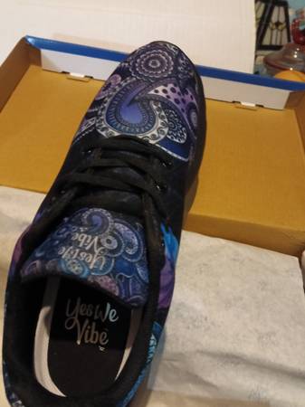 Elevate your shoe game with these Yes We Vibe sneakers in a stunning black, purple, blue, and teal Mandela print. Designed for women, these athletic shoes are brand new and come in a size 10W. With a comfortable and stylish sneaker style, these shoes are perfect for any active woman on the go. The unique color combination and bold pattern make these shoes a statement piece, perfect for adding a pop of color to any outfit.