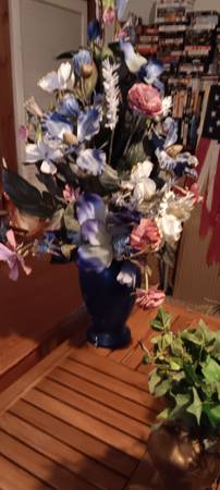 This is a beautiful arrangement of silk flowers inside this pretty blue vase that is 14 inches tall and is in excellent condition. The top of the flowers is 44 inches tall call or text