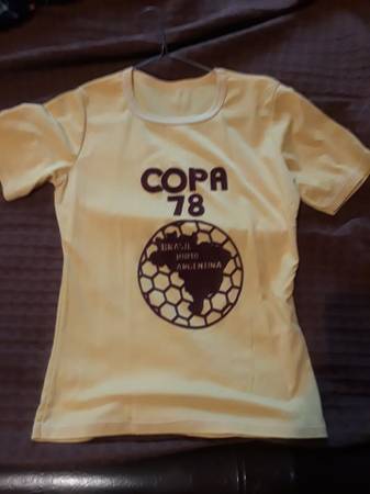 THIS SHIRT WAS GIVEN TO ME FROM AN EXCHANGE STUDENT THAT SYAED WITH OUR FAMILY FOR A YEAR AND HE CAME HERE IN 1978 WHICH IS FROM WHEN THIS SHIRT WAS MADE FOR THE C O P A AND HAS THE CHALLENGE BETWEEN BRASIL AND ARGENTINA.