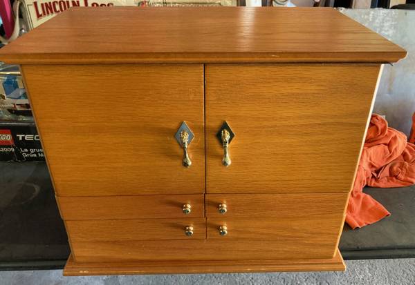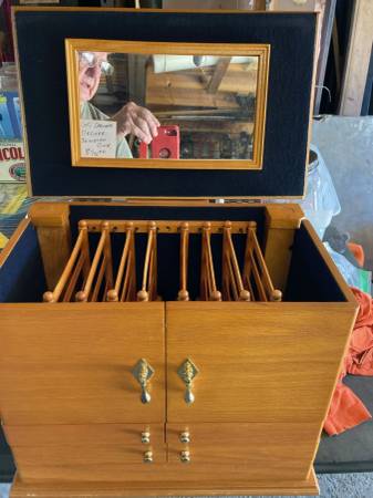The lid opens to a pretty large convenient dressing mirror where you can quick test to see if your jewelry matches a given outfit.