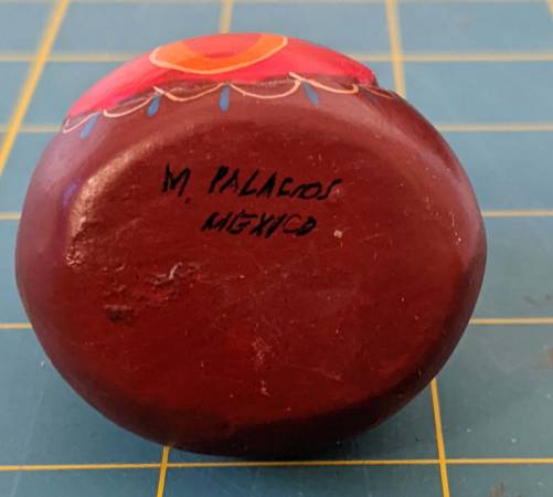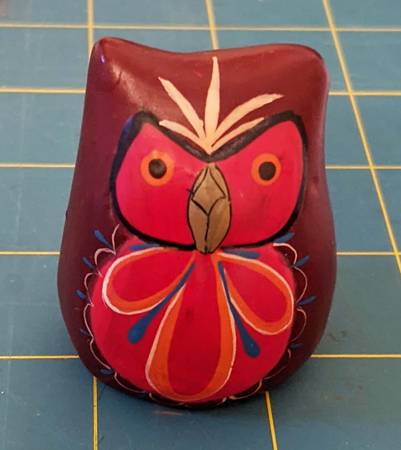 Mexico Folk Art Pottery Owl, Signed, hand painted Cheerful red handpainted owl on brown body. 2 inches tall. Includes explanatory card.