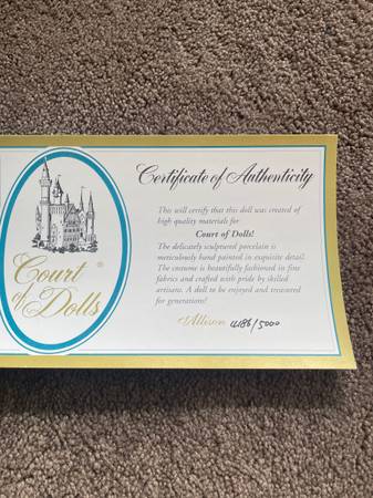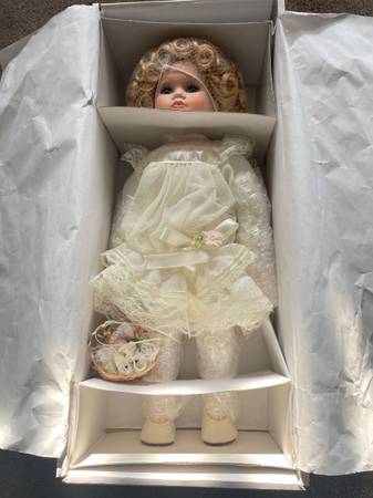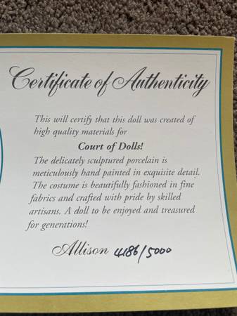 Court of Dolls . Porcelain doll in the box - never out of the box. Priced to sell $75 firm. Sold on firm come basis- no delivery- pick up only. 6 1 4 two 7 one 3two 6two