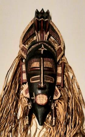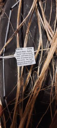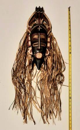 This vintage African tribal mask is a Senufo mask made with raffia, known as a "Kpelie" mask. It features a unique design with intricate details and "hair" made from raffia adorned with puka shells. The mask measures 16¾ inches in height and 32 inches with the addition of the raffia "hair." With its African cultural roots, this collectible piece represents a traditional art form that holds historical and artistic significance.