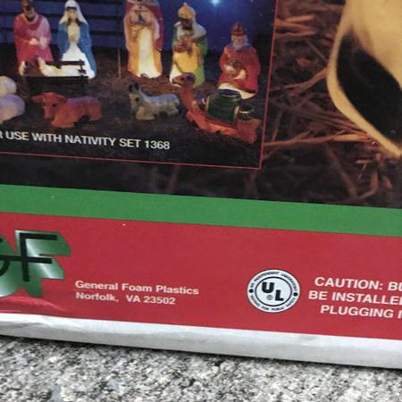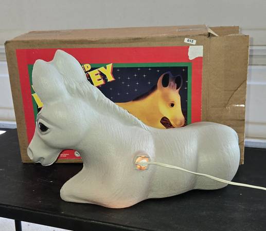 General Foam Plastics Nativity Donkey. Great shape. Hole on tail that is supposed to be there maybe Light tested and works. Original box has some normal wear from storage. Nothing significant. Donkey measures 18" long x 12" tall x 7" wide.