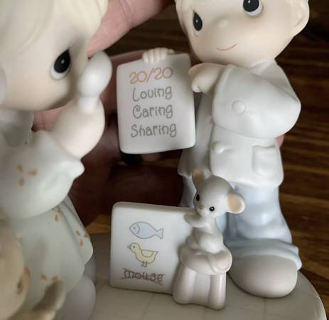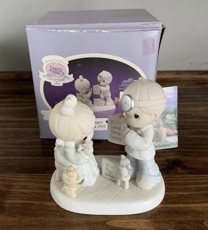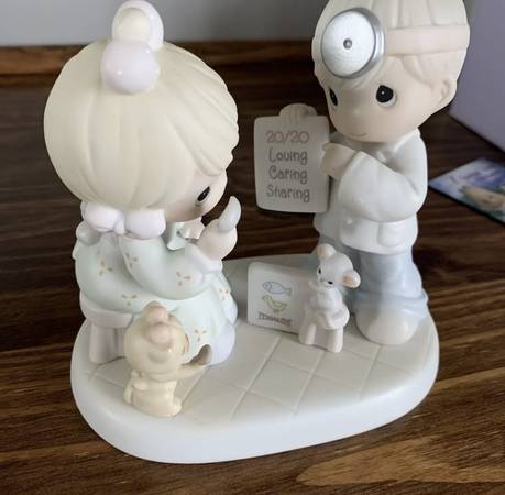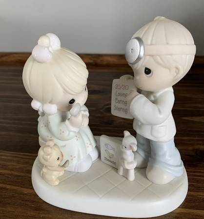 This Precious Moments figurine, titled "Precious Moments 306843 20 Years And The Vision's Still The Same Limited Edition," is a special 1997 limited edition piece celebrating the 20th anniversary. It features a boy and girl, an eye doctor, and a cat and mouse, all part of the Precious Moments collection. Made of porcelain and painted in vibrant colors, this figurine is a nostalgic piece from the late 20th century. It is a charming addition to any room and a perfect gift for collectors of Precious Moments or those who appreciate faith-themed decor.