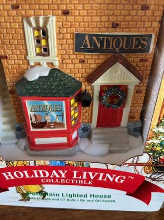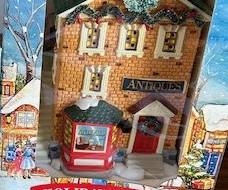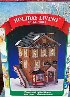 The product is a rare vintage Noma Dickensville Christmas village antique shop. This large Christmas village piece is made of porcelain and features a multicolored painted finish. It comes in its original box from the late 20th-century collection of Dickensville villages. Perfect for any room during the holiday season, this collectible adds a festive touch to any Christmas decor with its all-over Christmas character and seasonal theme.