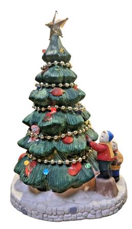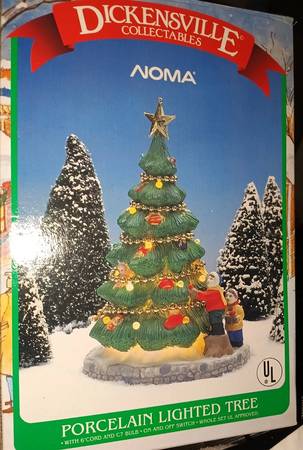 The Vintage 1994 Dickensville Porcelain Lighted Tree is a small 9" tall Christmas tree with a 6' cord and C7 bulb, perfect for indoor use. This illuminated tree features a bright multicolor finish with glitter, making it a festive addition to any holiday decor. It is part of the Dickens Village collection by Dickensville Collectables Noma, representing a nostalgic and whimsical theme from the late 20th century. This retired piece is sure to bring charm and nostalgia to any seasonal display.