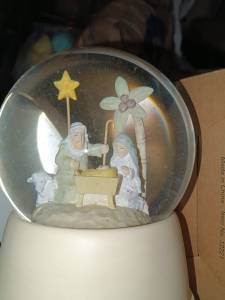 This vintage snow globe features a beautiful Mary, Joseph, and Jesus nativity scene, {I believe wound to tight}. The globe