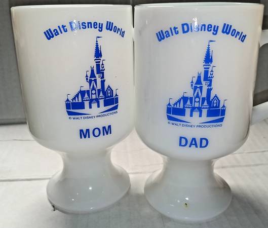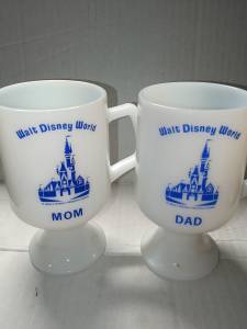 Vintage Walt Disney White Milk Glass Footed Souvenir Pedestal Mug Mom Dad Set