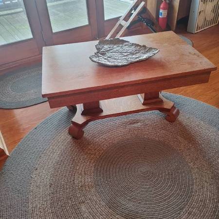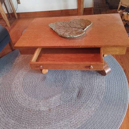Have this vintage oak coffee table with draw measures 42x26x20. Need more info email or call. See sample pics below