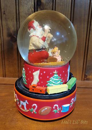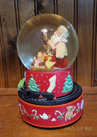 This 2001 Hallmark Coca-Cola Santa Musical Snow Globe features a festive scene with Santa seated with toys around him and holding a Coca Cola.