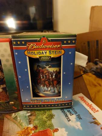 We have two Budweiser Holiday Steins for sale. $10 each. New still in box Budweiser 1998 Holiday Stein Grants Farm Holiday $10 Budweiser 2002 Holiday Stein Guiding The Way Home $10