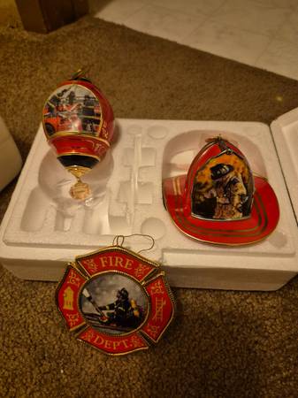 Bradford Editions "Courage Under Fire Heirloom Collection" Christmas Ornaments. Limited edition made between 2001 and 2002. Each issue (set of three) includes certificate of authenticity, with three different porcelain ornaments (a flat ornament, a bulb ornament and a fireman helmet ornament). Brand new, never been out of boxes (except to have picture taken for ad!). Would like to sell whole collection (12 sets of three) for $500. These are a collectors item and can no longer be purchased through Bradford Editions and this a a great price for the complete, brand new set. I've seen these being sold on Ebay for a higher price and theirs are used!