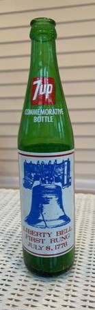 Vintage 7-UP Commemorative Bicentennial Bottle w/Liberty Bell - 1776-1976. Measures 11" tall, 16 oz. Released in 1976. A limited-edition soft drink bottle to celebrate the USA Bicentennial (the...