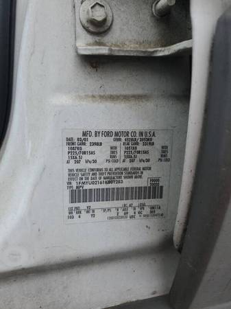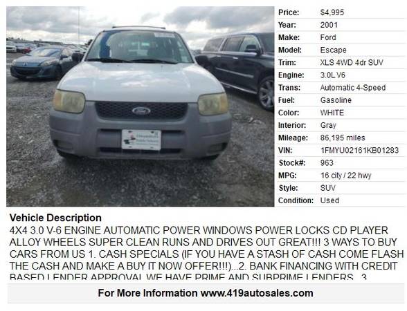 2001 FORD ESCAPE XLS 4X4 3.0 LITER V-6 ENGINE 86,000 MILES RUNS GREAT AUTOMATIC POWER WINDOWS POWER LOCKS POWER SEATS ALLOY WHEELS CD PLAYER SUPER CLEAN WHITE WITH GRAY CLOTH INTERIOR THIS SUV RIDES AND DRIVES OUT GREAT CARFAX REPORT AVAILABLE FOR YOUR REVIEW $5995 CASH SPECIAL OR $1000 DOWN DOWN 45 DAYS UNTIL FIRST PAYMENT IS DUE 3 WAYS TO BUY CARS FROM US 1. CASH SPECIALS...2. BANK FINANCING WITH LENDER APPROVAL WE HAVE PRIME AND SUBPRIME LENDERS...3. PREMIUM BUY HERE PAY HERE!!! WE MAKE IT HAPPEN FOR YOU!!! CALL 4:19 AUTO SALES AT 614 382 4419 OR COME AND VISIT US AT 8560 E. MAIN ST. REYNOLDSBURG OH 43068 OPEN MONDAY TO SATURDAY 10 TO 7 AND SUNDAY 12 TO 7 WE ACCEPT CASH CHASE QUICK PAY WITH ZELLE AND ALL MAJOR CREDIT CARDS THANKS FOR LOOKING!!!