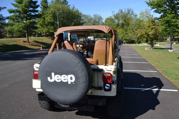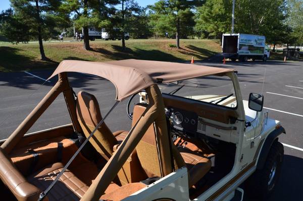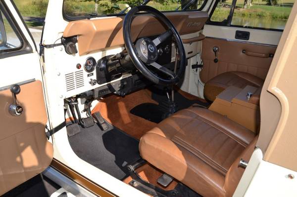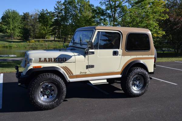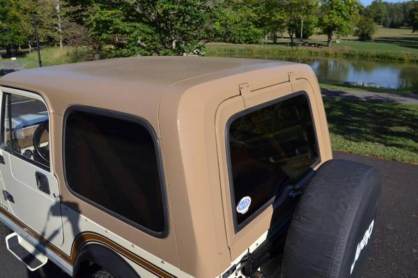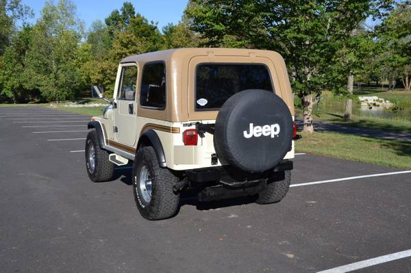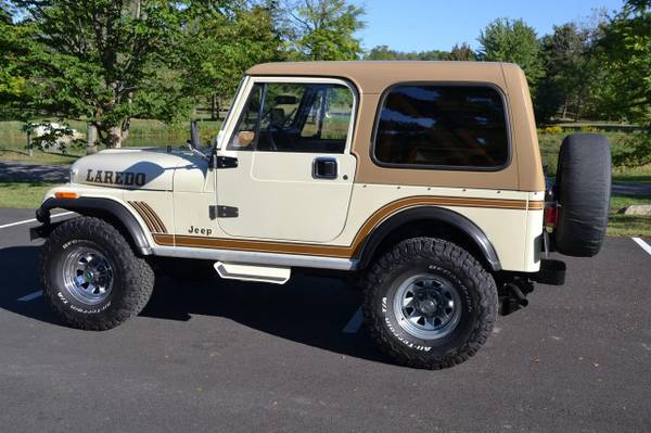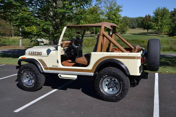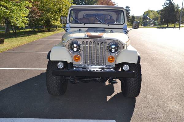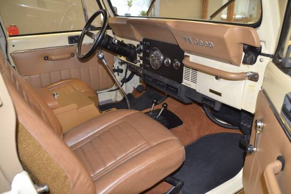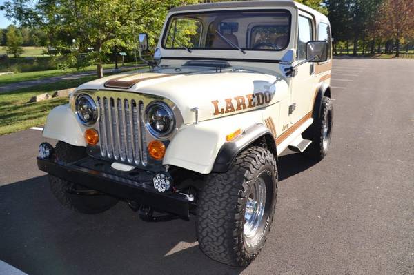 1986 Jeep CJ-7 Laredo Finished in Beige over Honey vinyl, the truck is powered by a 5.3-liter V8 linked with a five-speed manual transmission and a dual-range transfer case. Equipment includes a Novak Adapters engine swap kit, a short ram air intake, a custom exhaust system, manually locking front hubs, KYB dampers, disc brakes, 15″ steel wheels, 33″ BFGoodrich tires, KC HiLiTES auxiliary lights, LED headlights, a removable hardtop, a bikini-style soft top, removable full-metal doors, a roll bar, a cabin heater, crank windows, and a JVC CD stereo.