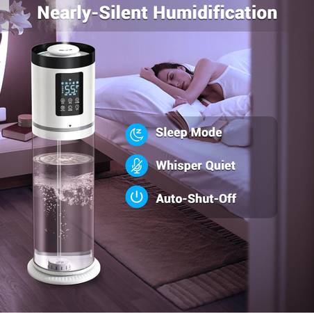 [Sleep Mode & Touch Screen] The humidifier features a 35dB whisper quiet sleep mode,making it perfect for use in the night without disturbing your sleep. There's a user-friendly touch screen on top of the humidifier and a remote control making it easy to use for people of all ages.and its top fill hole is wide enough that you won’t have to scrub around any awkward corners. The humidifier has a simple cleaning process that makes it easy to keep it running efficiently