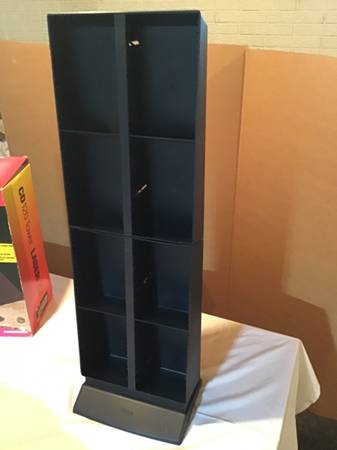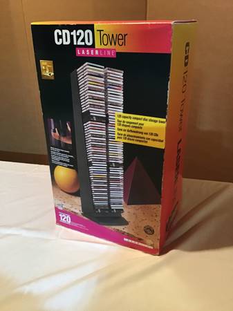 Stores 120 CDs in an easy. to read angled tower. Tower is about 36” high. (it comes in two parts).