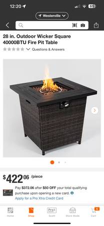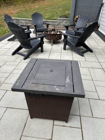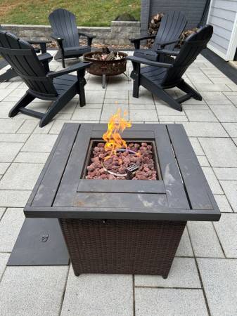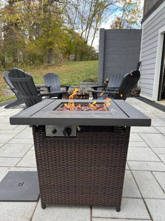 For sale is an outdoor 28 inch wicker fire pit table. It is a couple years old, but still in very good condition. This outdoor fireplace uses propane fuel to provide stability and burns cleanly (propane tank not included). Weather-resistant wicker is woven over a sturdy, steel frame to ensure this fire pit table will withstand the elements. Enjoy more tablespace: take the lid off the built-in side hooks and cover the pit to add more space for family and friends to enjoy a light meal. Ignitor no longer works, we just use a lighter. New gas regulator and hose recently replaced. Screenshot from Home Depot is not the exact model, but a very similar one.